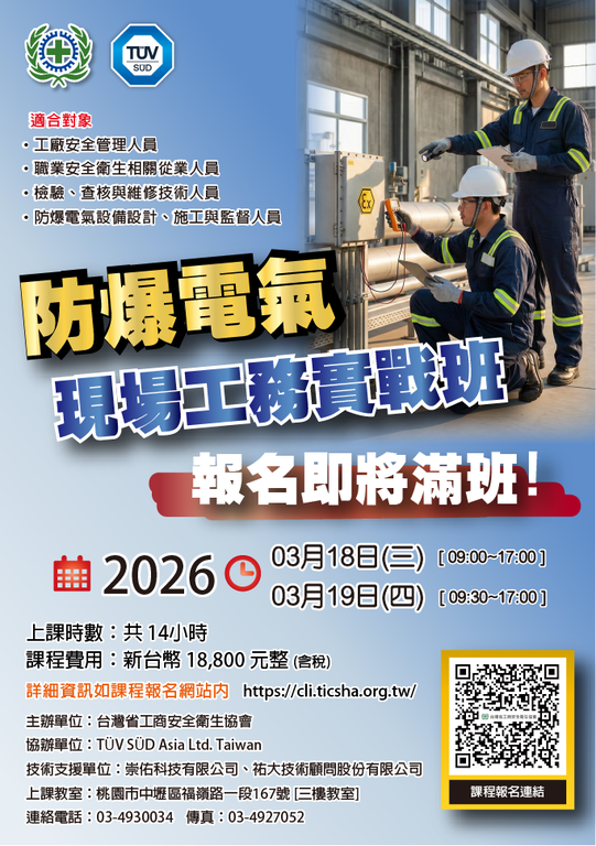 為強化第一線工程與管理人員於防爆電氣設計、施工及監督管理之實務能力,並協助企業符合職業安全衛生及防爆相關法規責任,本中心開設「防爆電氣現場工務實戰班」。